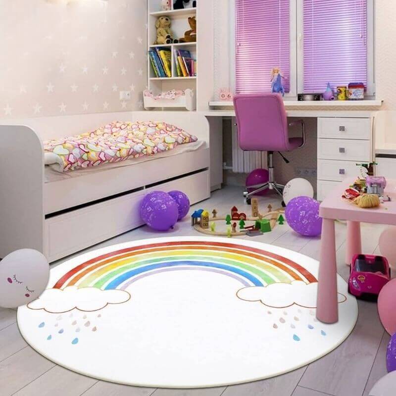 Découvrez le tapis rond arc-en-ciel pour enfants, un élément de décoration qui convient aux petites filles comme aux petits garçons. Sa surface est lisse antidérapante offre un espace de détente, de jeu ou de lecture à votre petit.