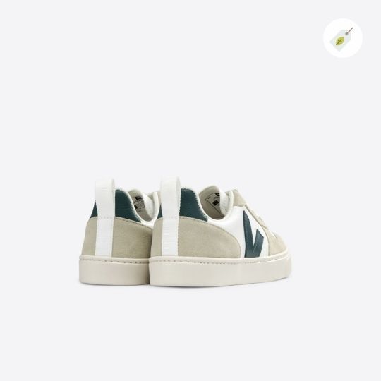 Les baskets enfant V-10 LACES CHROMEFREE LEATHER WHITE BRITTANY ALMOND de chez VEJA sont fabriquées avec du cuir ChromeFree, un cuir bovin tanné sans chrome, provenant de fermes situées au sud du Brésil. Ce cuir subit un processus de tannage innovant qui n’utilise aucun chrome, métal lourd ou acide dangereux, réduisant ainsi la consommation d’eau et d’énergie. Les chaussures présentent des empiècements en suède et en cuir ChromeFree, ainsi qu’un logo V en caoutchouc d’Amazonie. La semelle intérieure est composée de canne à sucre et de coton biologique, tandis que la semelle extérieure est en caoutchouc d’Amazonie. Les chaussures V-10…