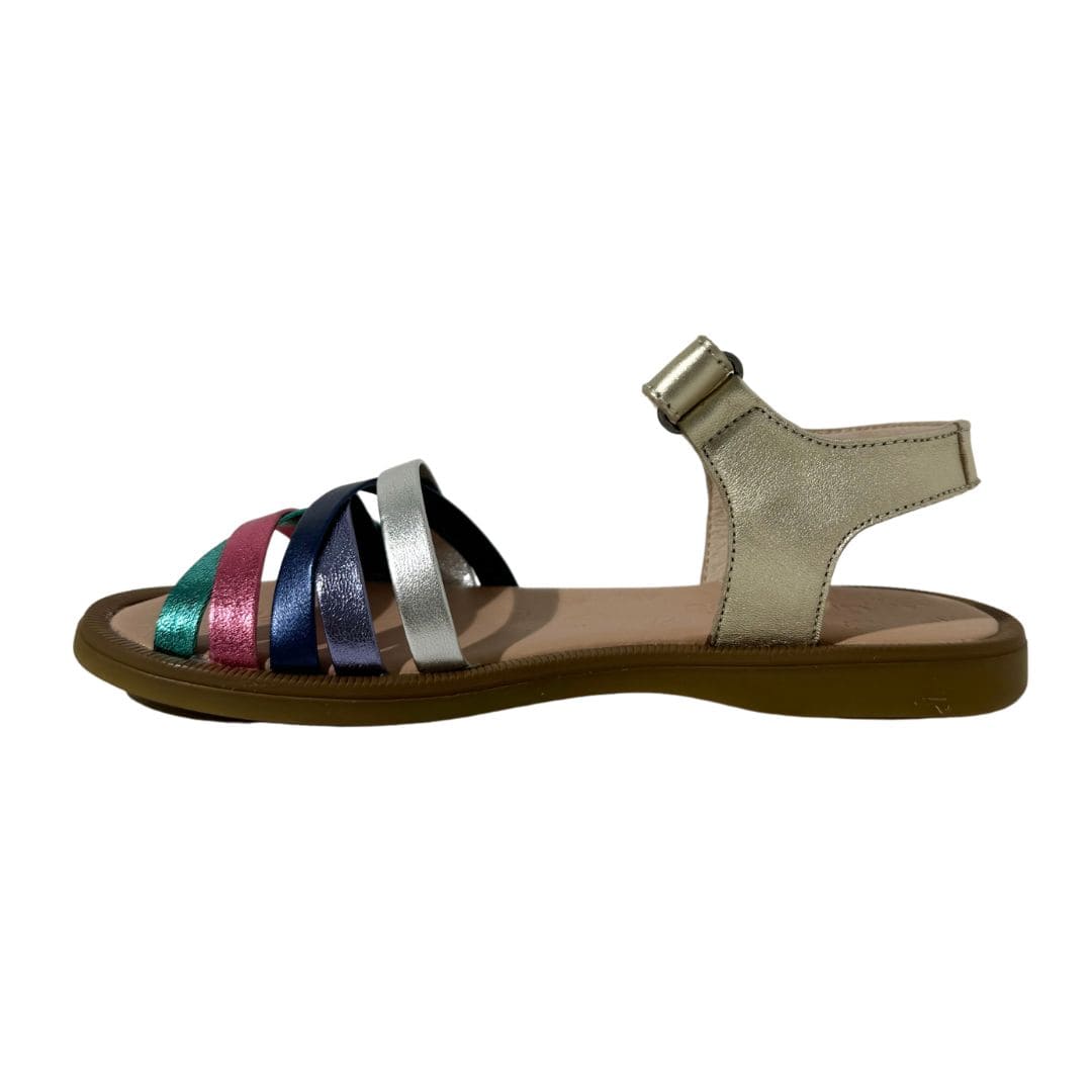 La sandale est à la fois confortable, légère et colorée, avec ses lanières croisées en cuir métallisé.
