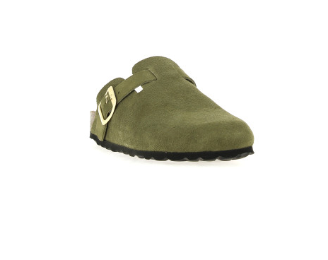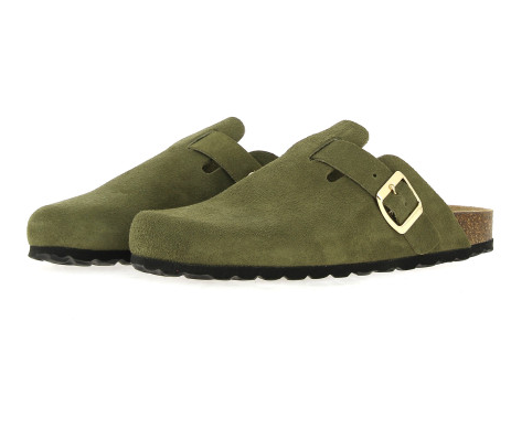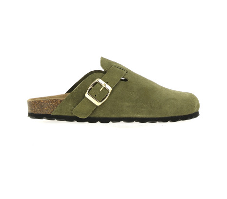 Découvrez les sabots de chez La Maison de l’Espadrille en nubuck kaki avec sa boucle ajustables sur le côté et son talon ouvert.